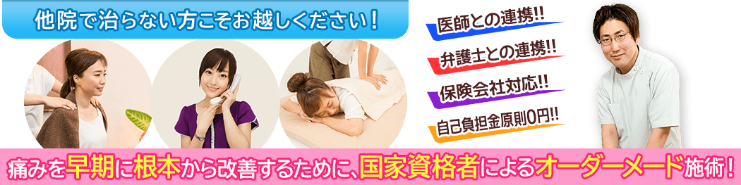 当院では、そのような場合であったとしても、しっかりと施術を受けていただけるよう、交通事故に詳しい弁護士の指導のもと、法律上適切に対応させていただきますので、安心して通院いただけます。